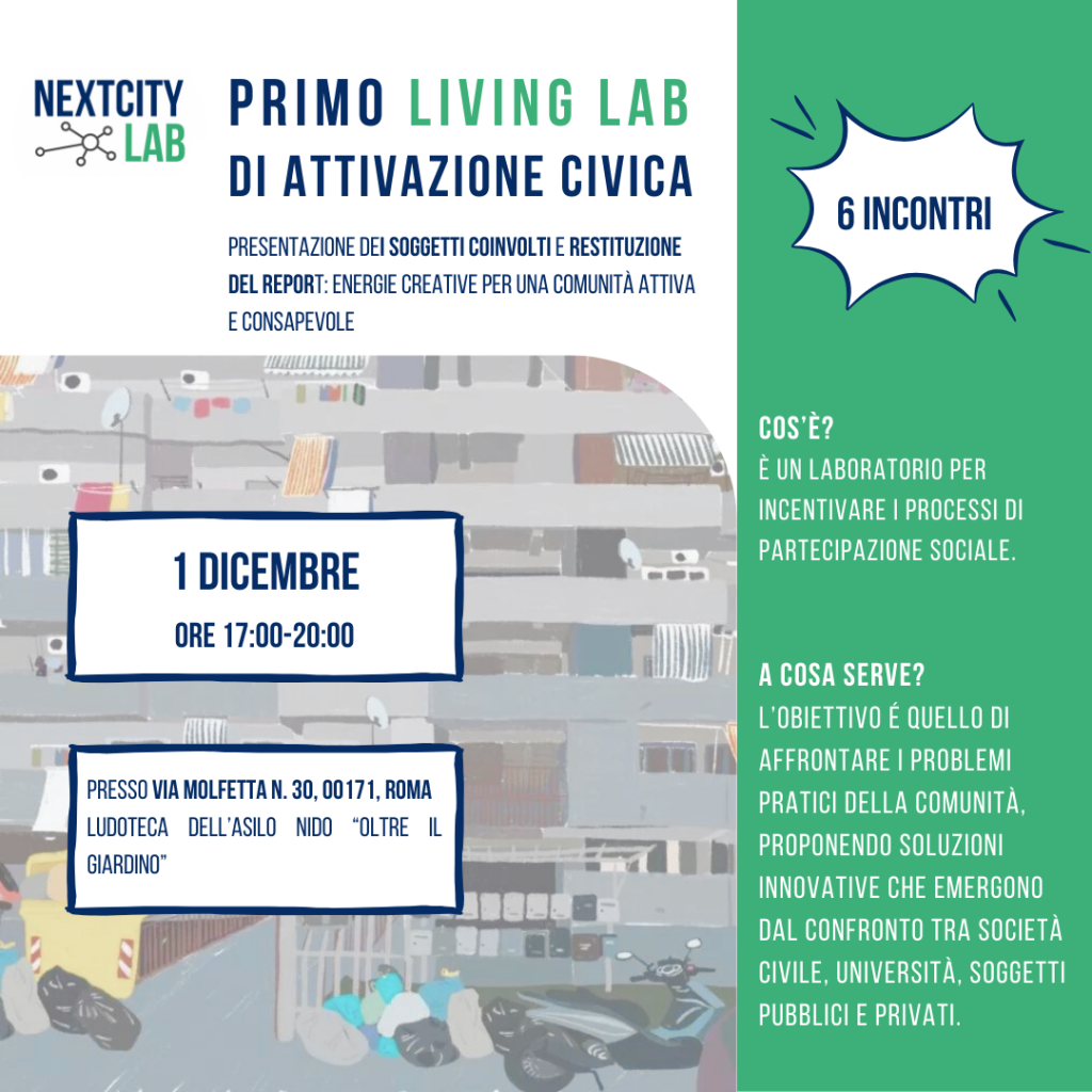 Venerdì 1 dicembre 2023 si è tenuto il primo dei sei incontri del NextCityLAB al Quarticciolo, presso la Ludoteca dell’asilo nido “Oltre il giardino” in Via Molfetta n. 30.